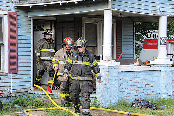 EXITING STRUCTURE – Three Humboldt firemen, (from left) Lucas Reasons, Alex Trudo and Austyn Rogier exit the blue house that caught fire after the blaze was extinguished and under control. Unfortunately, the house suffered major damage and is a total loss.