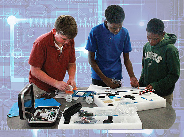 ROBOTICS – Sixth graders (from left) Carson McClanahan, Cortney Bufford and Demarion Emerson work together in the Humboldt Jr./Sr. High School library on a new set of robotic educational devices.