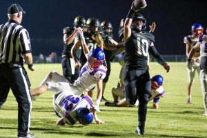 Dresden’s Cameron Schlicht (11) scores a touchdown against Obion County during high school football action on Sept. 22, 2023.