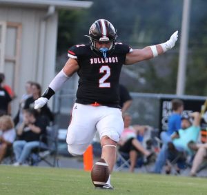 Gleason’s Aiden Legens (2) kicks the ball on a kickoff against Perry County during a Week 2 high school football game at Gleason.